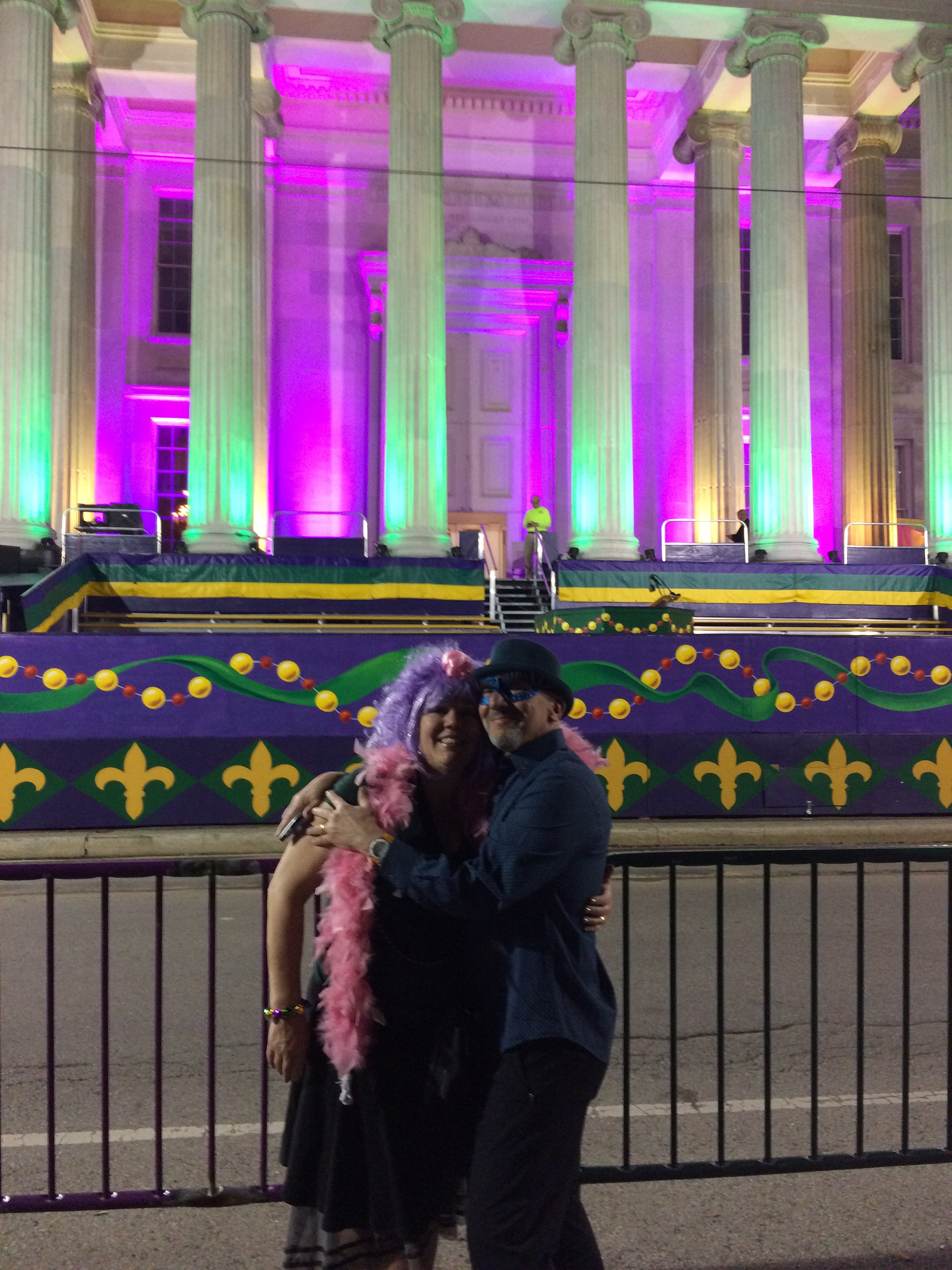 If you’ve read my blog, or if you know me at all, you know that I love New Orleans. Right now it’s Carnival season, leading up to Mardi Gras in just over a week, with several parades a day, attendant light and music and noise, and a whole lot of what the late Miss Ella Brennan of Commander’s Palace gleefully called “eating, drinking, and carrying on.” Here’s a photo of Chuck and me two years ago, across from Gallier Hall, waiting for the Mystic Krewe of Nyx parade to begin.