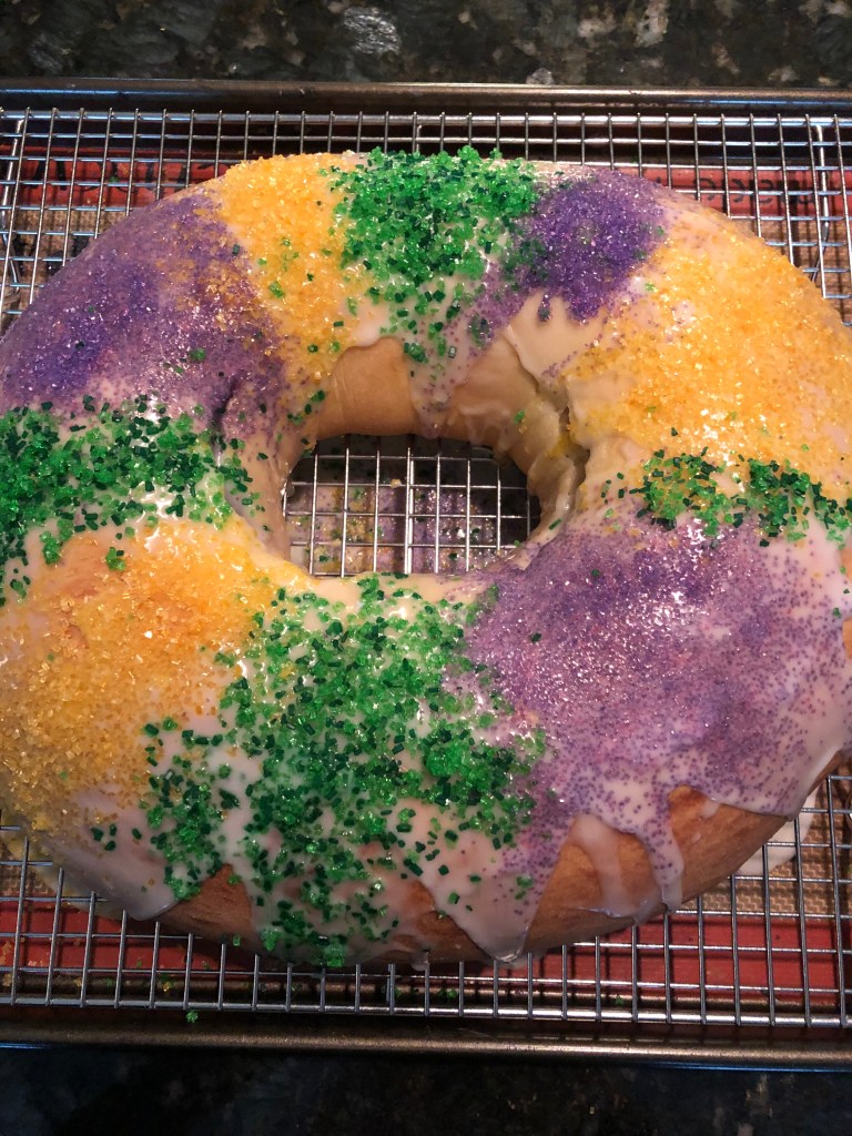 Tomorrow at work we will celebrate two fine ladies who share a birthday on February 24. Instead of my usual chocolate cake or raspberry bars, I’m baking a King Cake, the traditional sweet treat of Carnival season throughout the Gulf South. I found a recipe for a King Bundt Cake on the excellent site Brown Eyed Baker but I can’t find my damn Bundt pan! So I’m using my own recipe for a traditional freeform ring instead. This King Cake is more like a sweet bread than a cake.